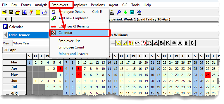 i) From the main menu in Payroll Manager, click ‘Employees‘ then ‘Calendar‘, and select the relevant employee.